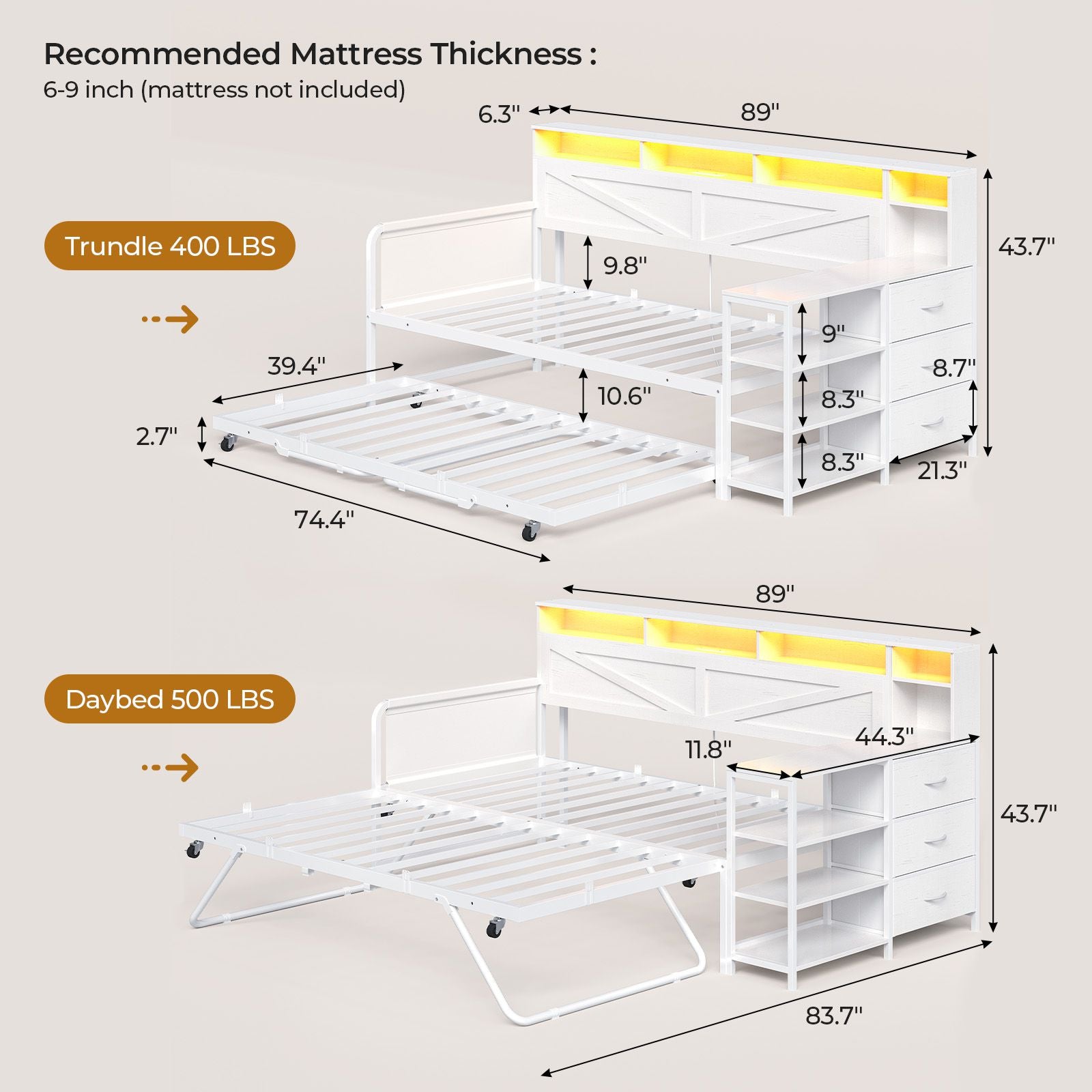 AOGLLATI Daybed with Pop Up Trundle and 3 Storage Drawers Farmhouse Corner Bed Frame with Charging Station LED Lights