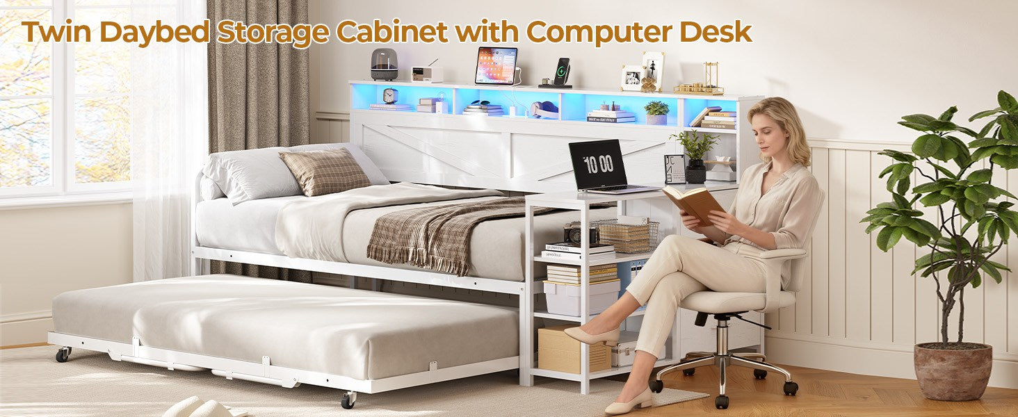 •【Twin Daybed with 3 Drawers and Shelves】 Features a one-stop storage design with a storage cabinet that can be flexibly installed on either side to perfectly complement your room layout. The 44.3"D × 13.8"W computer desk meets daily work and entertainment needs. The 3 fabric drawers measure 21.3"D × 11.4"W × 8.7"H. 3 shelves provide storage for books, toys, or electronics. Additional storage pockets on the opposite side offer extra organization space.