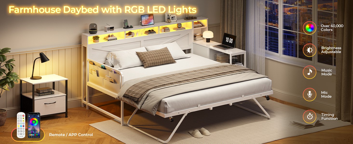 •【Dynamic RGB LED Ambient Lighting】 This daybed twin features dazzling RGB LED lights, seamlessly blending practicality with fun. Easily switch colors, adjust brightness and flashing effects via the app or remote control, schedule on/off, mic and timing function. The lights can even pulse to the rhythm of music, creating a dreamlike space for sleep and gaming. Its soft glow also serves as a thoughtful nightlight.