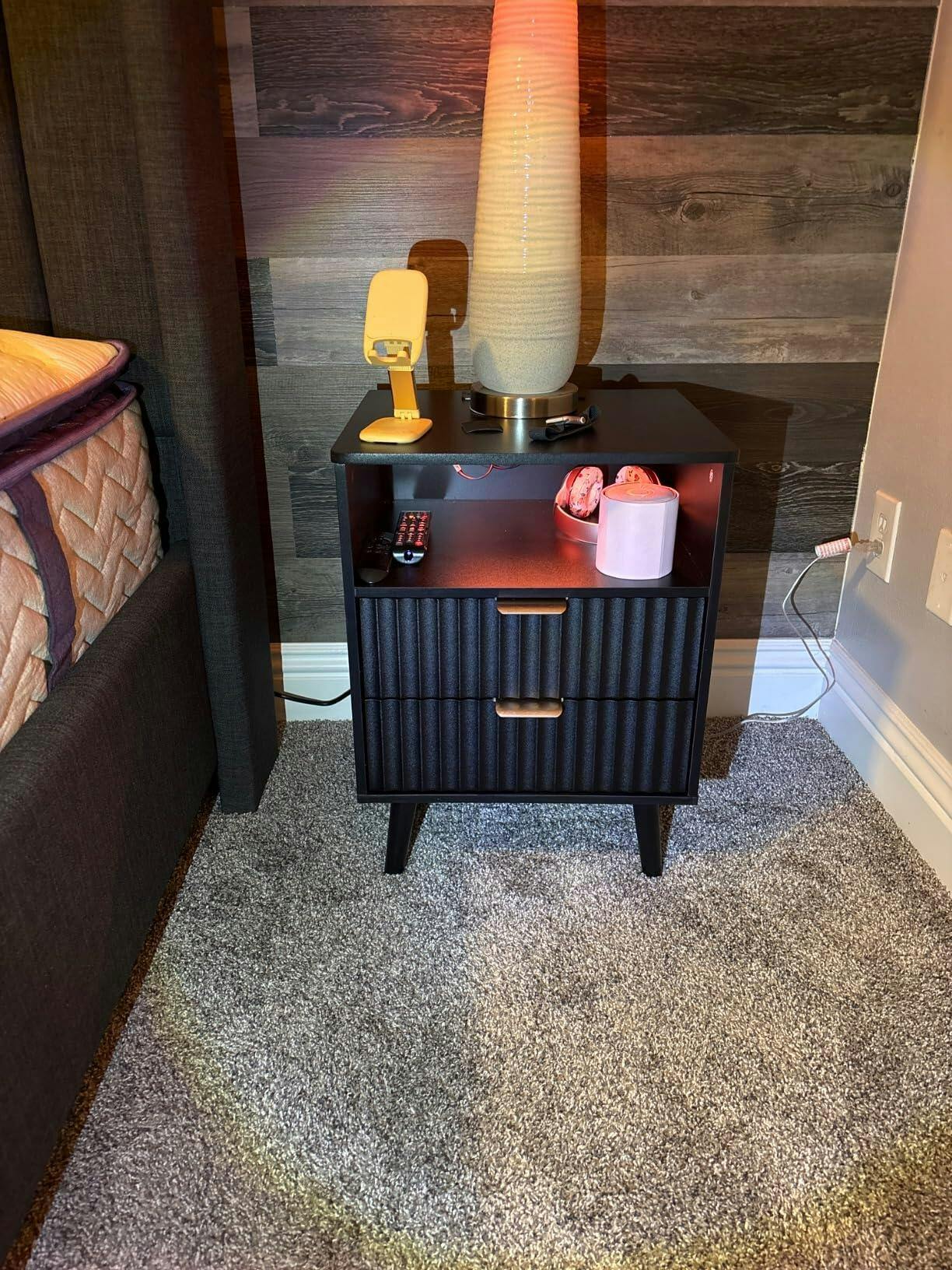 【Modern Fluted Design Combines Classic Look】This fluted nightstand combines the distinctive waveform fluted panel with champagne gold aluminum handles, making this natural black nightstand both functional and visually striking. The smooth lines and rounded corners make this modern nightstand safe for kids and families, creating a standout piece that elevates the ambiance of your room.