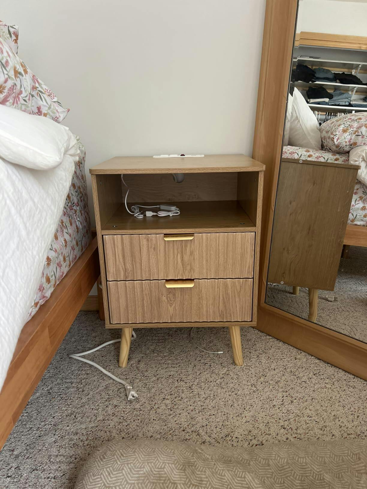 【Sturdy & Durable Construction】Made of optimal engineered wood and based on 4 solid wood legs, this 2 drawer nightstand can bear 50lbs and the drawer 20lbs each. The sturdy construction ensures stability and durability, making it a practical and long-lasting addition to your bedroom. The cushion pads on each leg can protect your floor from scratching and noise resistant.