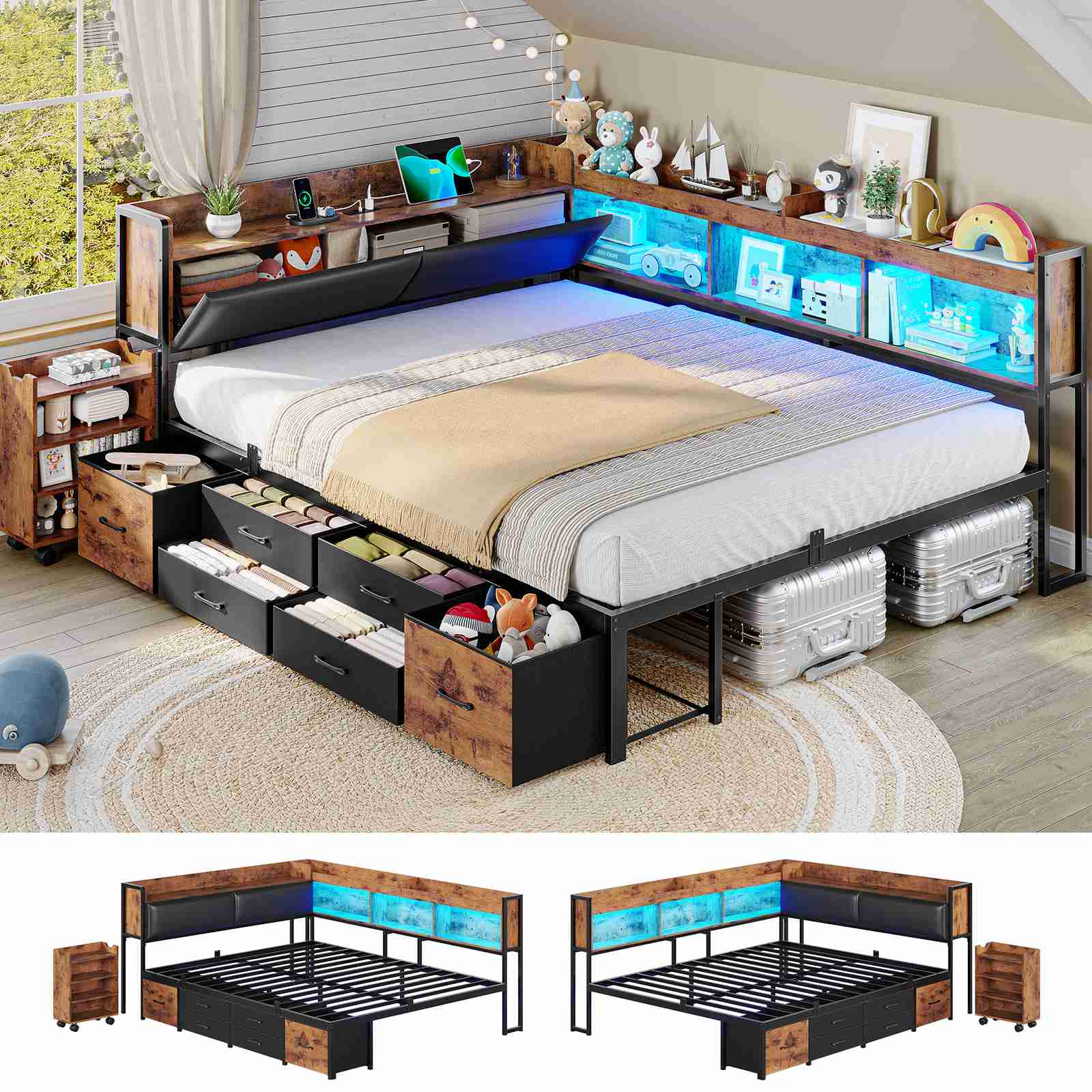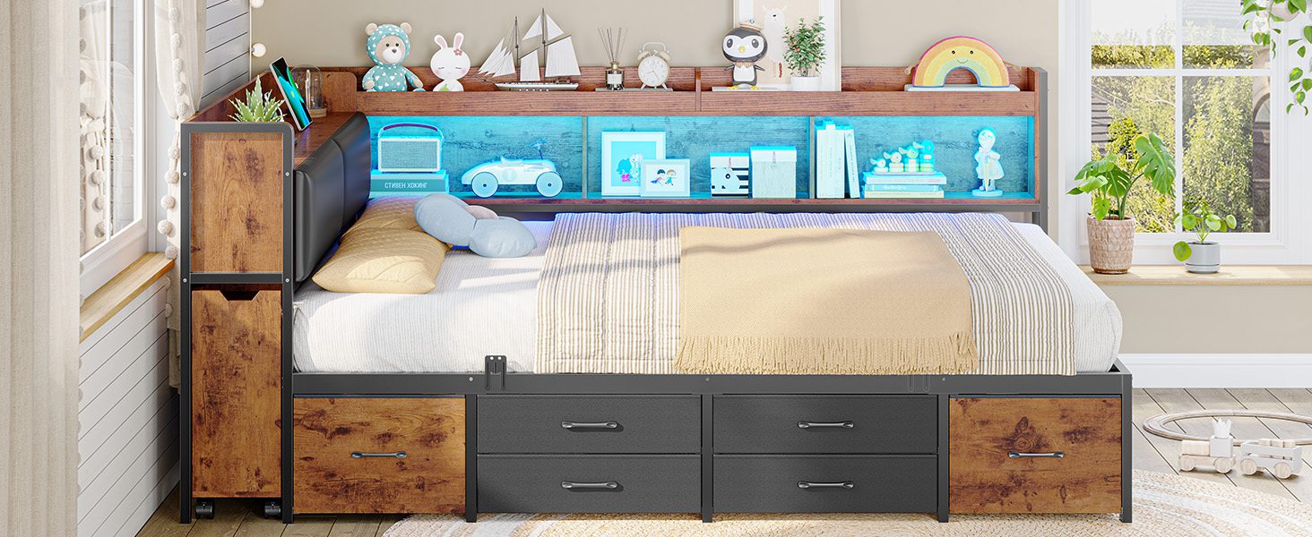 AOGLLATI Full Corner Bed Frame with Bookcase and Hidden Storage Daybed with Charging Station and Led Lights for Kids Teens