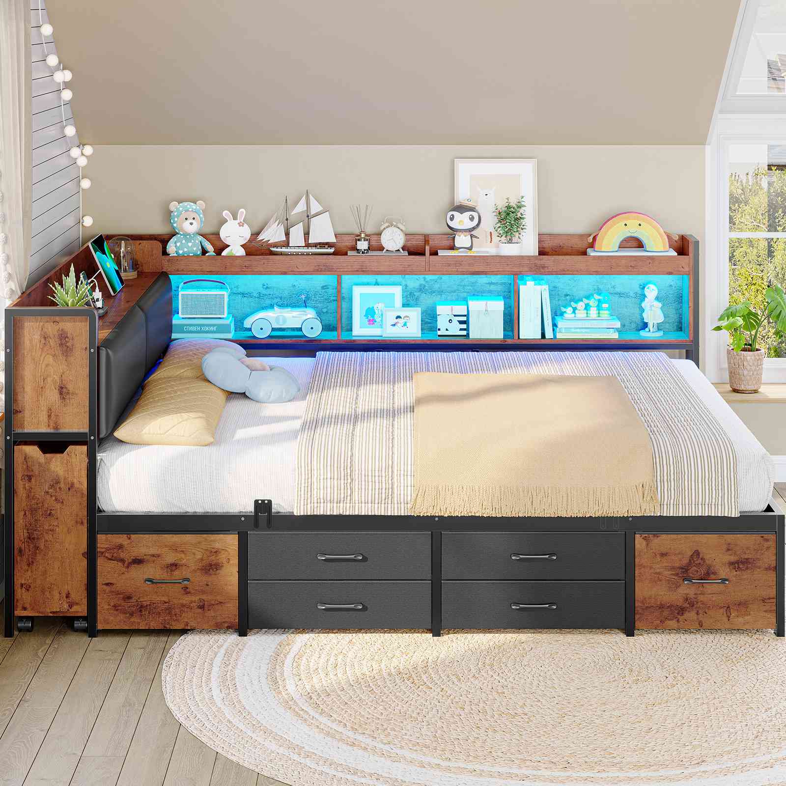 7 Bookcase Storage and "T" Top Shelf Storage, Charging Station, Concealed Bedside Table, Hidden Storage Headboard, LED Lighting, Storage Drawer