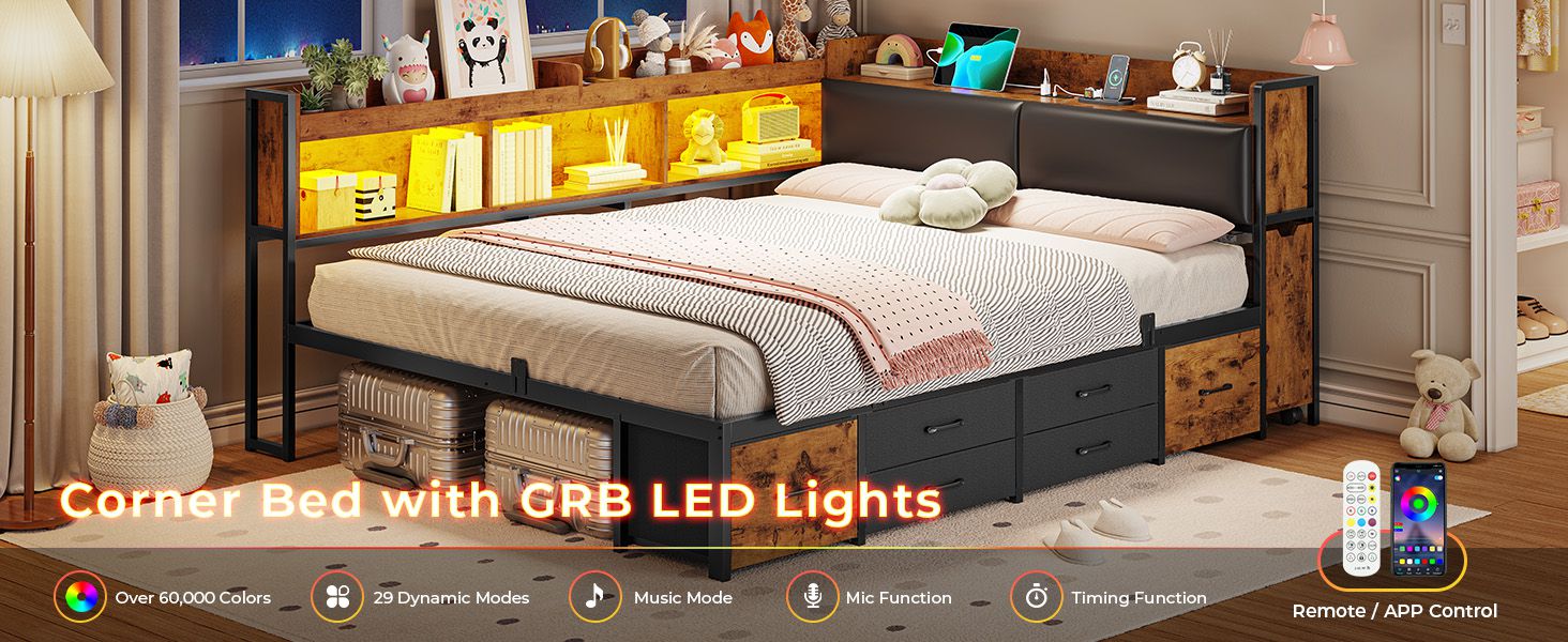AOGLLATI Full Corner Bed Frame with Bookcase and Hidden Storage