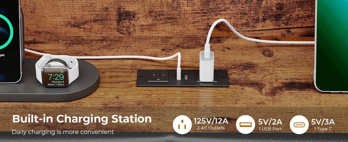 • Built-in Power & LED: 2 AC outlets, 1 USB, 1 Type-C; soft RGB lighting.