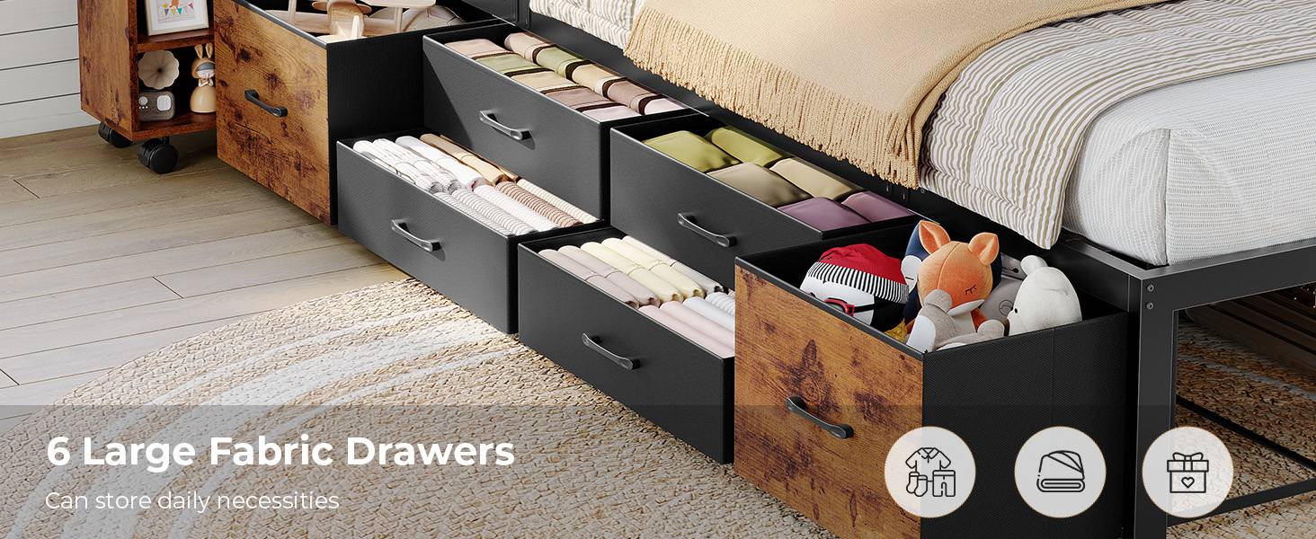 • Large Capacity: 6 fabric drawers + 12.4" under-bed clearance for luggage or bulky items.