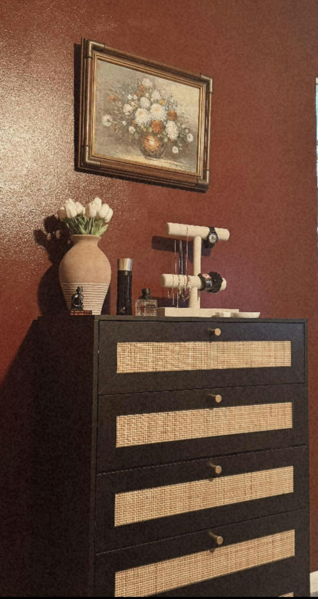 The dresser & chest of drawers with nature rattan design. It can fit any room decor while adding a stylish touch to your bedroom,the gold metal handles can be pushed in and pulled out silently and easily.