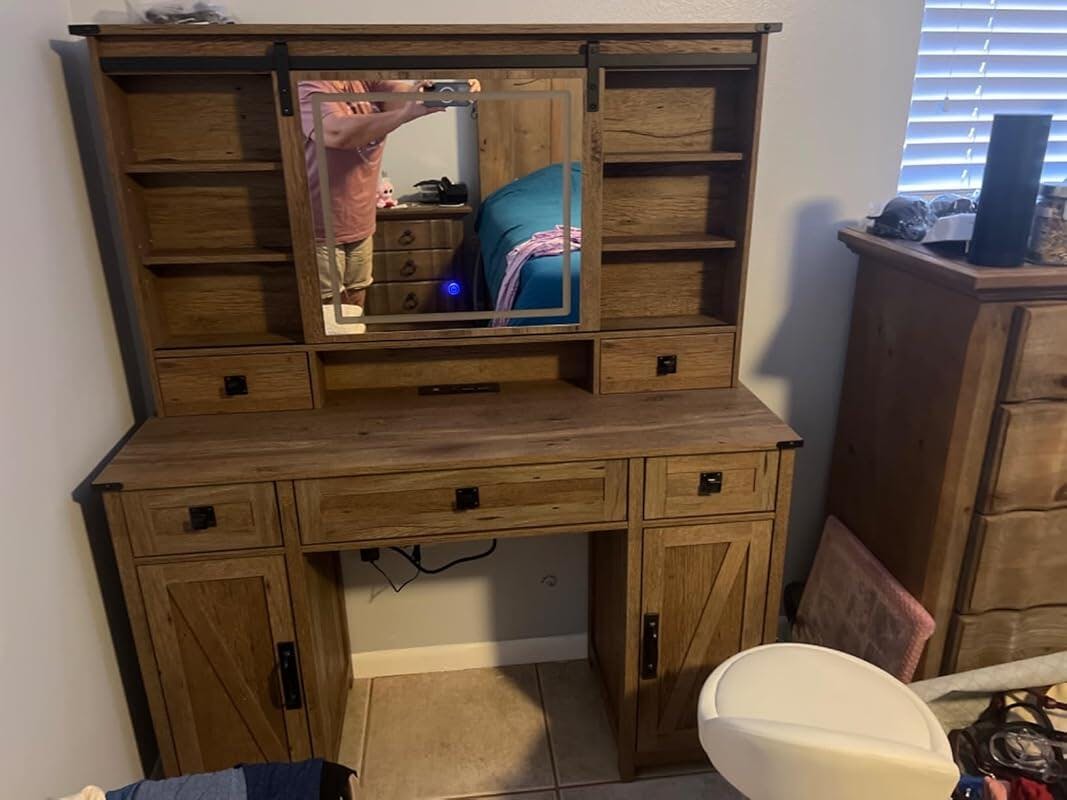 Overall Measuring: 47.2"W X 16.1''D X 57.1"H. The rustic wood grain finish and sliding mirror design add a sense of retro and aesthetic to your bedroom environment. The hanging rail of the sliding mirror contains guide grooves for smooth pushing and pulling, and the sliding mirror can be moved freely to the desired position. This vanity desk is an ideal gift for your wife, girlfriend, mom, daughter, or friend.